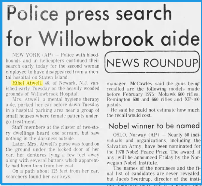 On October 24, 1978, Ethel Louise Atwell, a 46-year-old nurse’s aide from Newark, vanished on Staten Island. She was last seen arriving for her shift at the Staten Island Developmental Center (the former Willowbrook State School) before sunrise around 6 a.m.