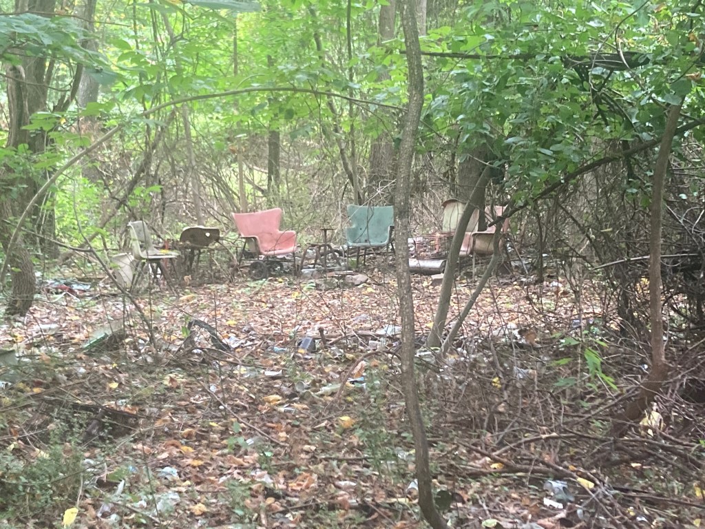 Now more importantly, getting back to our main focus is the disappearance of Ethel Louis Atwell. Along the white trail there is alot of evidence of vagrancy and dumped clothing. Below is a series of pics first illustrating a small camp I found very off the trail, which I saw from a distance. On a follow-up visit I encountered a park work I am familiar with and who said the parks employees were removing the below set of chairs I had found.