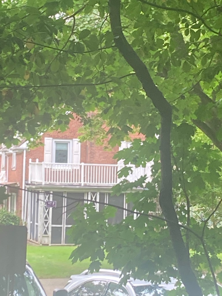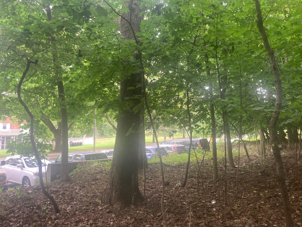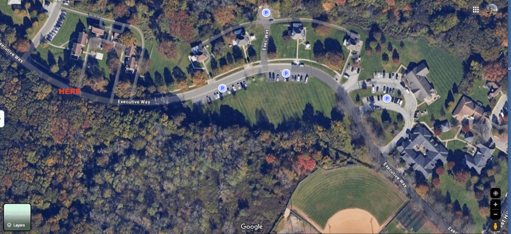 In this image you can see via the RED HERE note to the left is where the parking lot is obscured by the trees. My picture above this one is from inside that tree line in front of the parking within the woods.