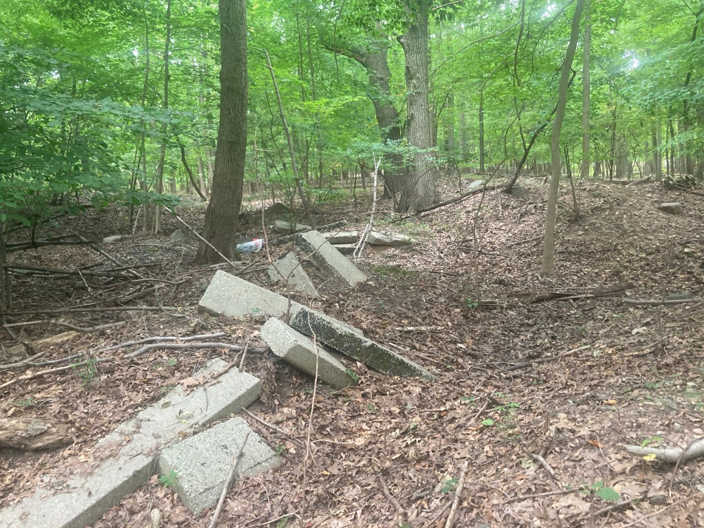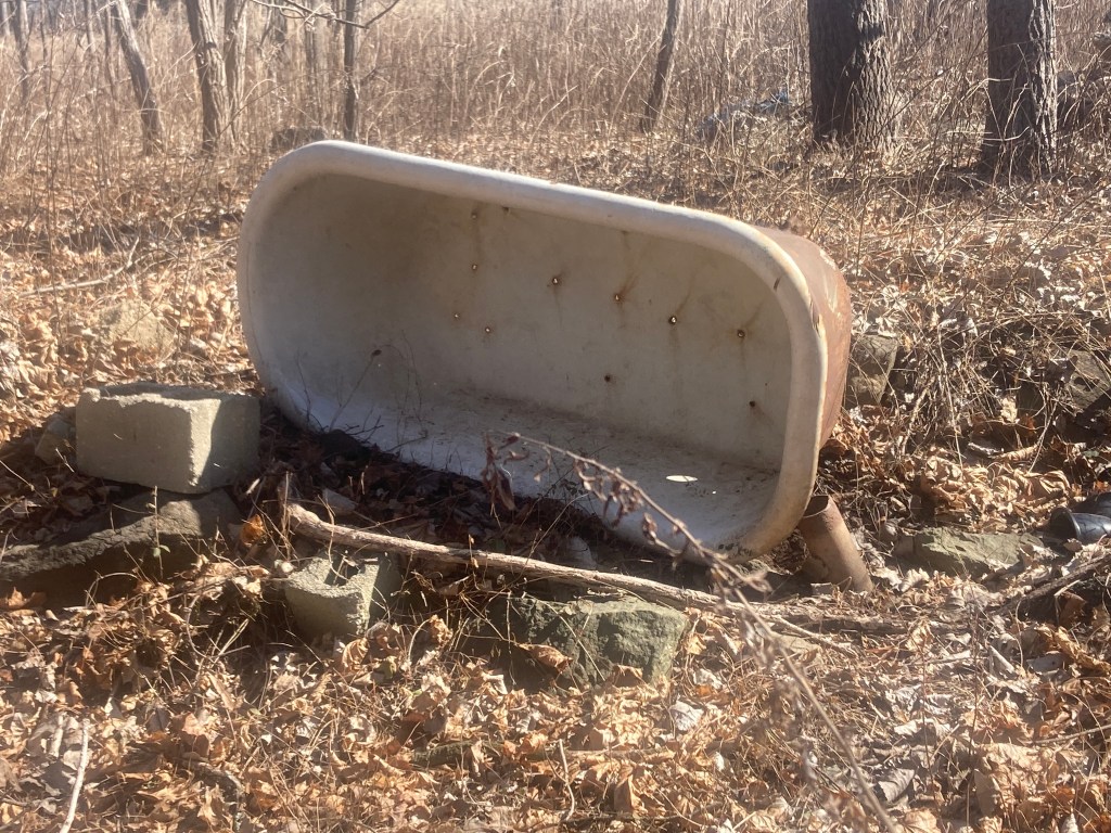 Further into the woods there is a ton more debris, such as what appeared to me as tile from a bathroom. What came as a surprise was the discovery of a bathtub!