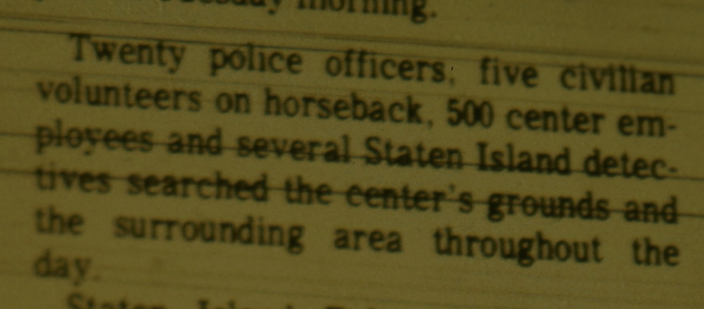 One question I have concerns Ethel’s yelling at her abductor, “No, you’ll hurt me.” Did she know her abductor, or at least recognize him? If her abductor was indeed Andre Rand, and she recognized him, does her statement indicate a reputation he had at Willowbrook? Rand was no longer an employee at Willowbrook State School but we know he had returned to camp in the area. This was alongside the vagrant population in the wooded area and tunnel system below Willowbrook.